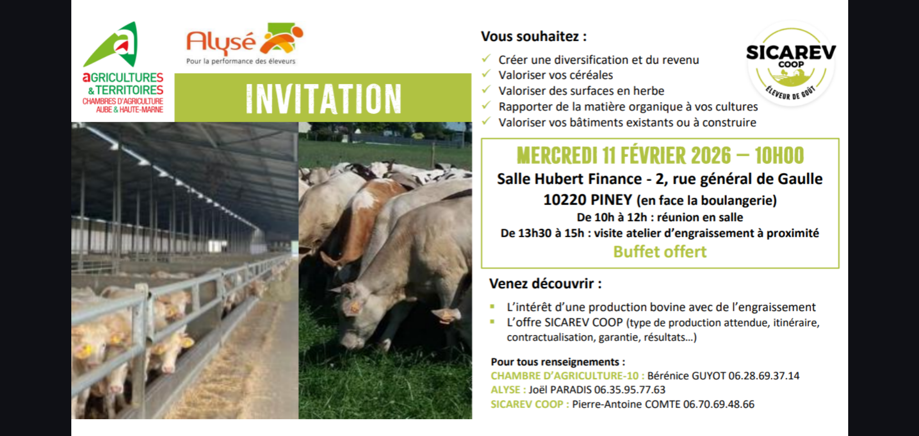 Dans un contexte de recherche de diversification et de sécurisation des revenus agricoles, les Chambres d’agriculture de l’Aube et de la Haute-Marne, Alysé et SICAREV COOP organisent une journée consacrée à l’engraissement bovin. Rendez-vous le mercredi 11 février 2026 à 10h à Piney pour découvrir une filière en plein développement, ouverte à tous les agriculteurs.